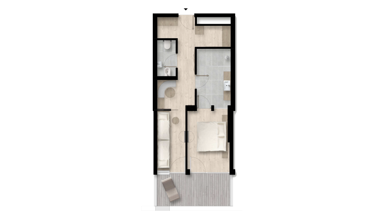 The children’s room features two single beds and a TV. In the master bedroom, you can sit back and relax with a TV, separate lounge area, mini fridge, microwave, and a coffee and tea bar. The bathroom, with its own entrance, offers a spacious shower and a separate WC with a bidet. Both rooms open onto the sunny south-facing balcony – your spot for savouring warmth and wide-open views.