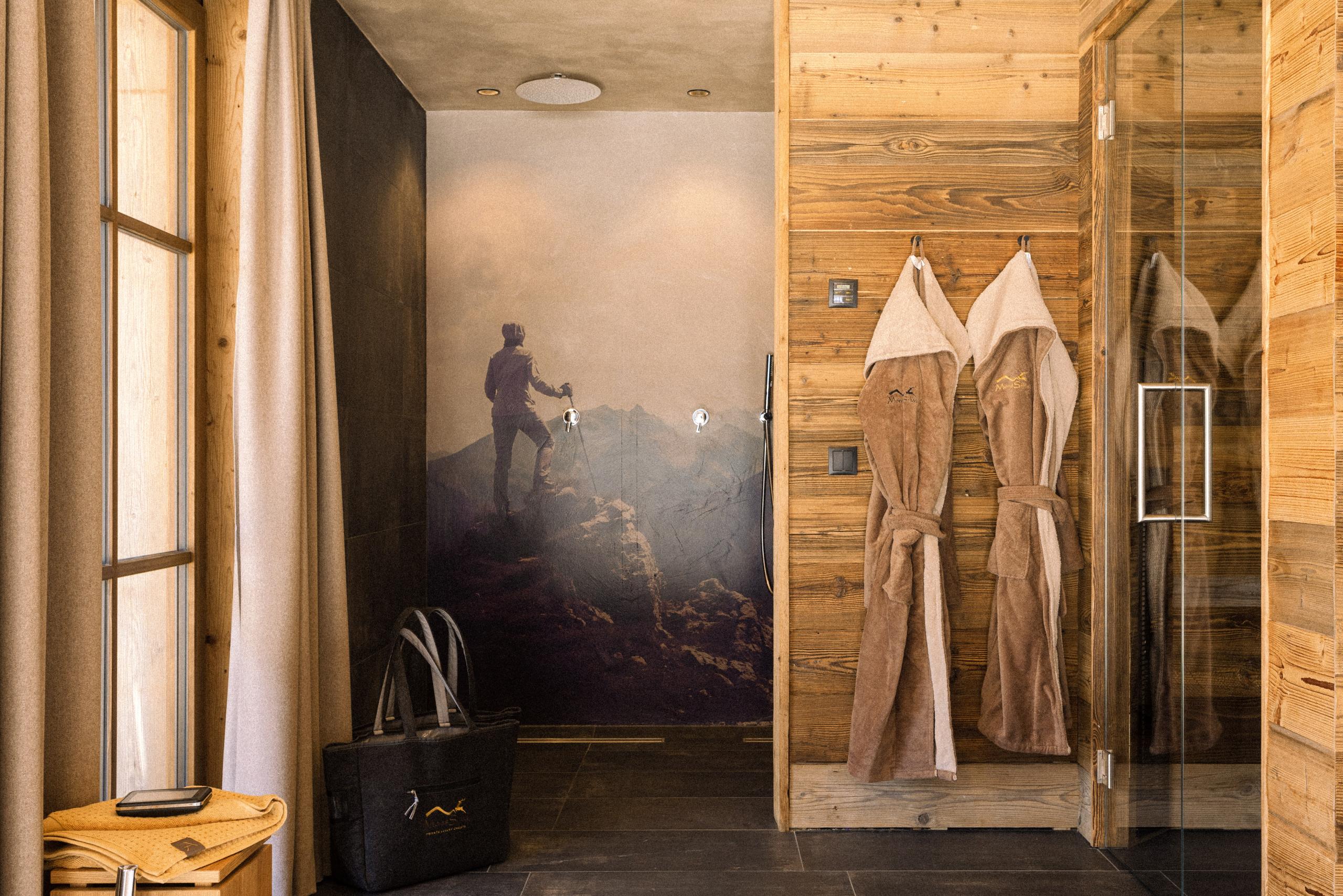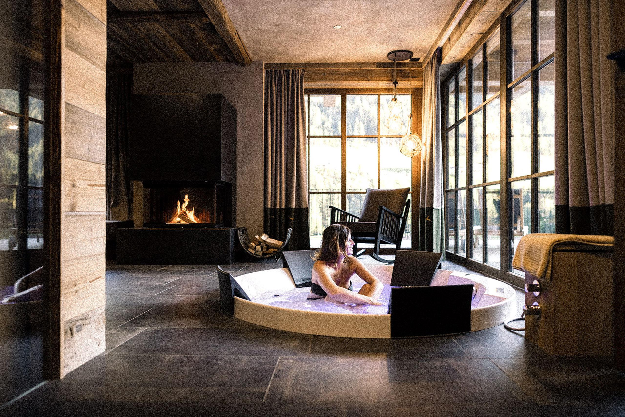 • Private spa in your chalet with a hot tub and cosy loungers on the sun terrace, Finnish sauna, couples’ shower, and whirlpool bathtub