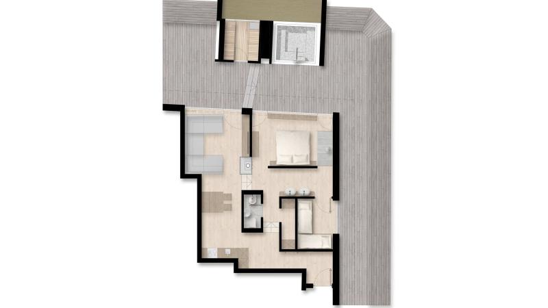 Spread over two levels, the luxurious suite houses a master bedroom, an open-plan living area with wooden flooring, sofa, TV, telephone, safe, walk-in wardrobe, and open fireplace. The open-plan bathroom features a spacious shower, double washbasin, and a separate WC with a bidet. A children’s room, with bunk beds and a single bed, as well as a TV, offers a cosy retreat for little ones. The open-plan kitchen with a hob, wine cooler, coffee and tea bar, oven, and cosy dining area completes the experience. All rooms are equipped with premium beds providing ergonomic support, ensuring truly restorative sleep.The private rooftop terrace with an outdoor sauna and panoramic whirlpool offers an exclusive natural experience providing perfect peace and tranquillity.
