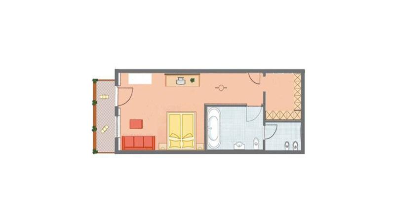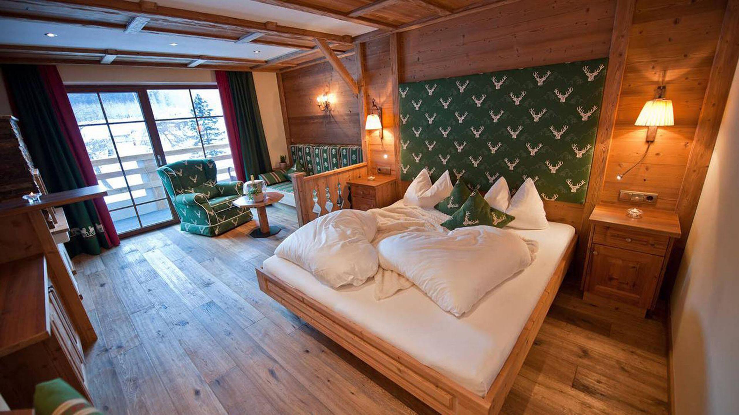 Wooden flooring, a sofa bed and a TV create a warm, inviting atmosphere. A balcony, walk-in wardrobe and bathroom with a shower and whirlpool bathtub bring added comfort. Also included: a safe, mini fridge, and everything you need to revel in restful days – all with Alpine charm.