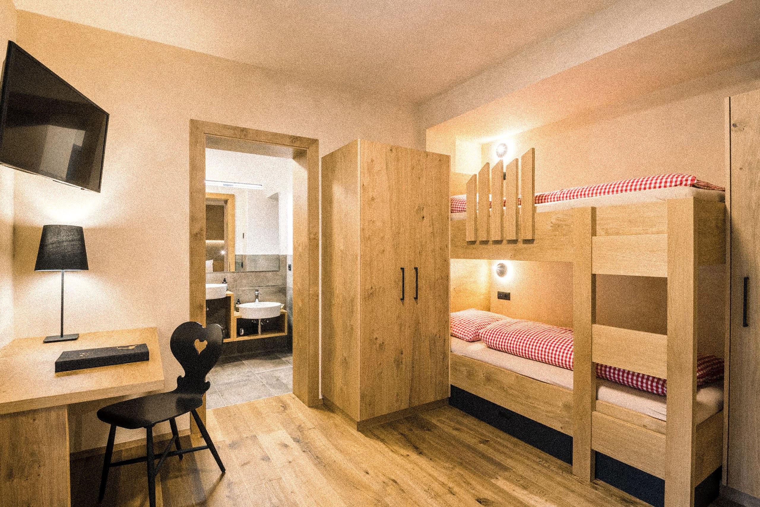 • Camera aggiuntiva con letto matrimoniale e letto a castello, TV, scrivania e bagno privato con WC, doccia effetto pioggia e doppio lavabo, di cui uno ad altezza bambini