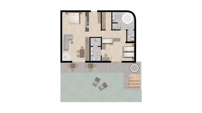 In questa esclusiva chalet suite di 88 m², il fascino del lusso naturale si incontra con il design tradizionale. Rilassatevi nel giardino di 60 m² con hot tub e sauna finlandese, mentre i vostri bambini si scatenano nel parco giochi avventura grazie all’accesso diretto al parco.