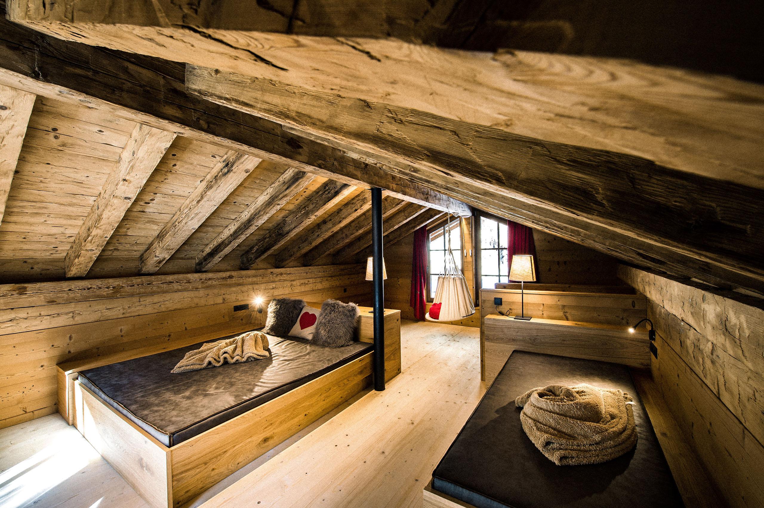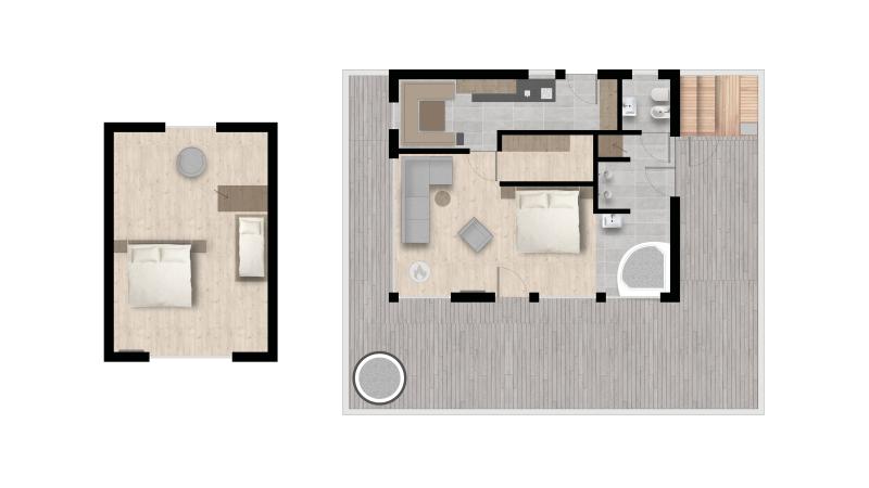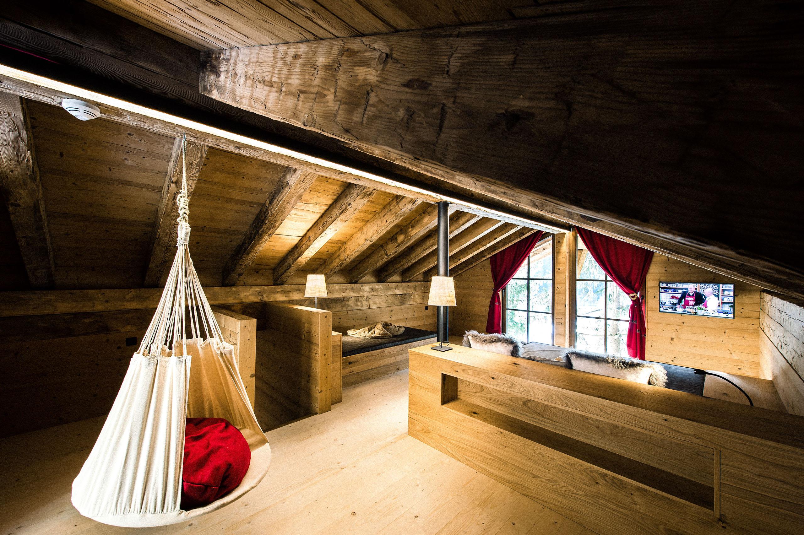Zona giorno e notte accogliente con pavimento in legno, divano, camino aperto, letti confortevoli con materassi lussuosi, cabina armadio, ambiente bagno aperto, vasca freestanding e zona WC e doccia separata. Mansarda per riposare e per trascorrere momenti di intimità preziosi. Sauna finlandese in terrazza. La cucina e la sala da pranzo sono separate dal resto della zona living.