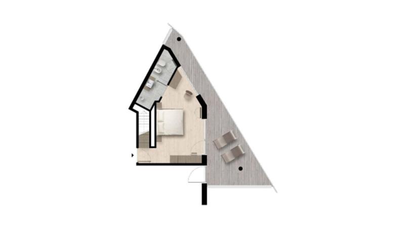 Das offene Wohn- und Schlafzimmer mit Sofa, TV, Telefon, Safe, Minikühlschrank, Kaffee- und Teebar, Mikrowelle und Balkon lädt zum Verweilen ein. Das Bad: lichtdurchflutet, mit großzügiger Dusche und separatem WC mit Bidet. Über eine Treppe erreichen Sie den Rooftop-Raum mit Daybed und Dusche sowie den Zugang zur privaten Dachterrasse mit Sauna und Panorama-Whirlpool. Der direkte Zugang zum Rooftop-Poolbereich: ein Highlight.