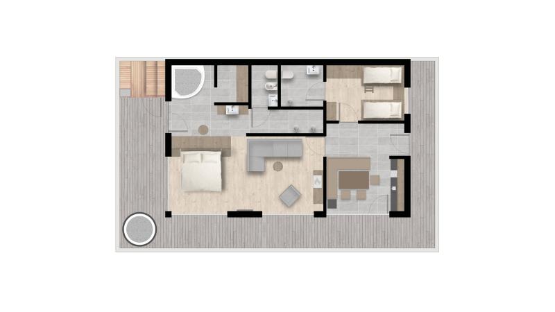 Gemütlicher Wohn- und Schlafraum, mit Holzboden, offenem Kamin, hochwertigen Gesundheitsbetten, begehbarem Schrank, offenem Badebereich, freistehender Badewanne und getrenntem Toiletten – und Duschbereich. Eigenes Kinderzimmer mit Stockbett und 1 Einzelbett. Finnische Sauna auf der Terrasse. Die Küche und der gemütliche Essbereich sind vom Rest des Wohnraumes getrennt.